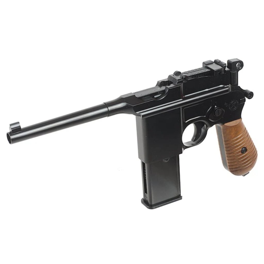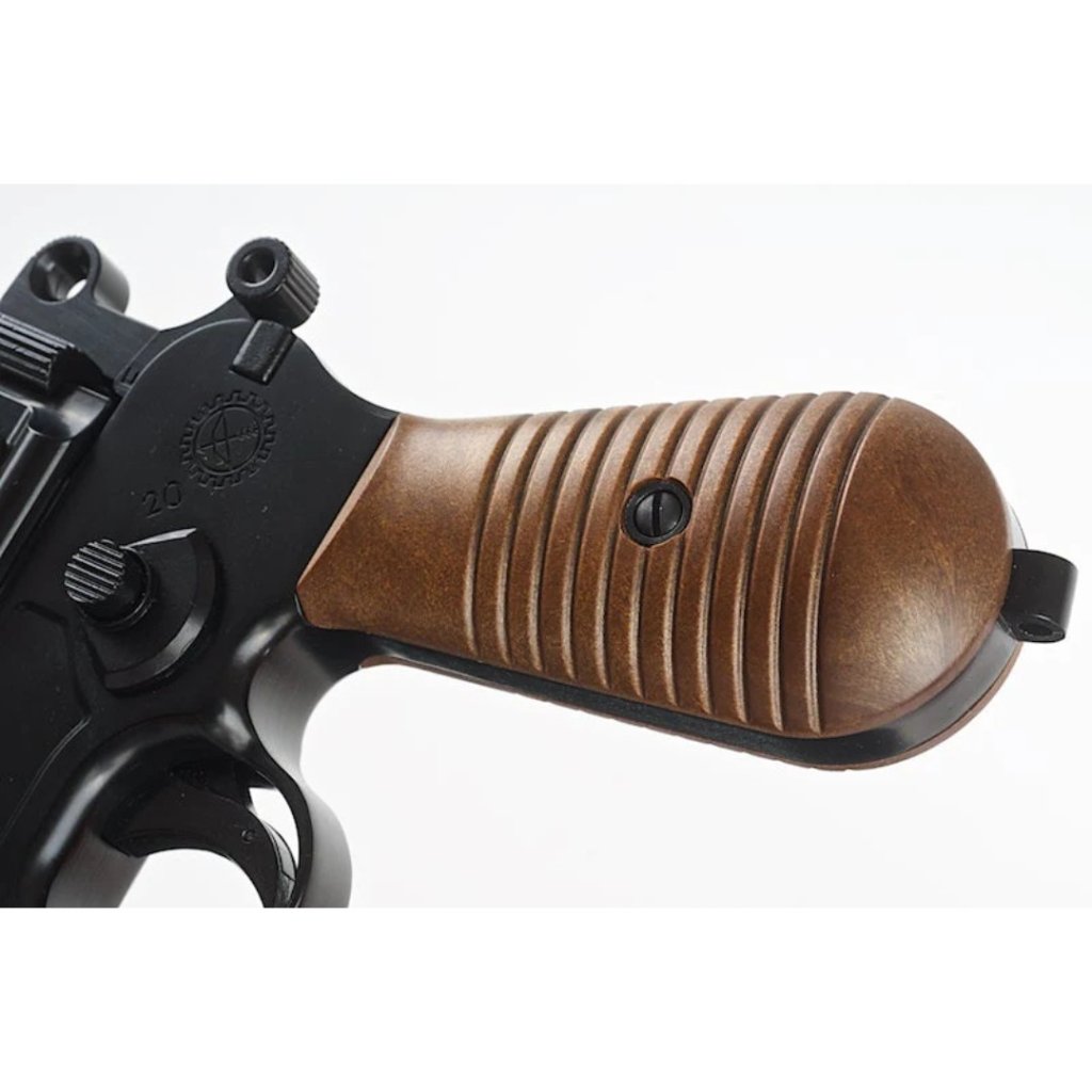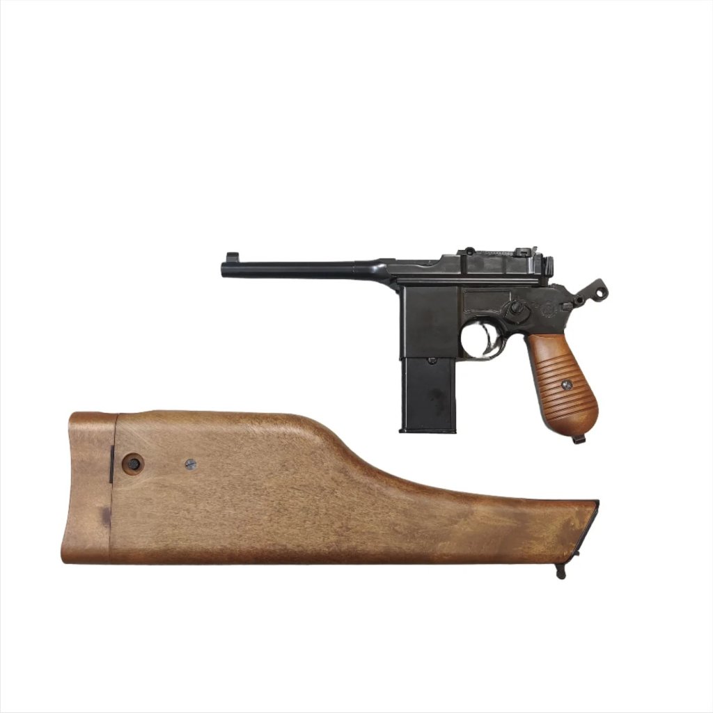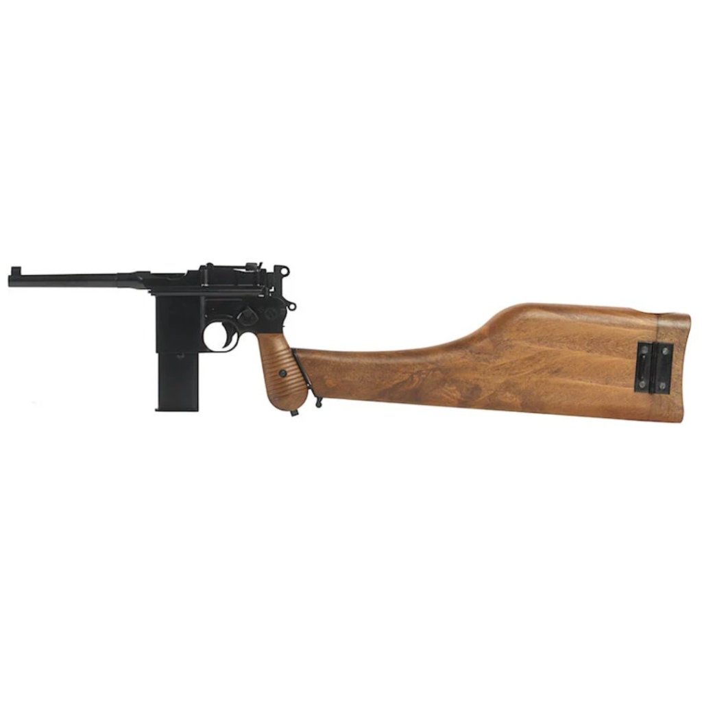 • The WE M712 'Broomhandle' is a select fire pistol in full metal with wood effect plastic handle grips and a detachable wood effect plastic stock that also works as a case.