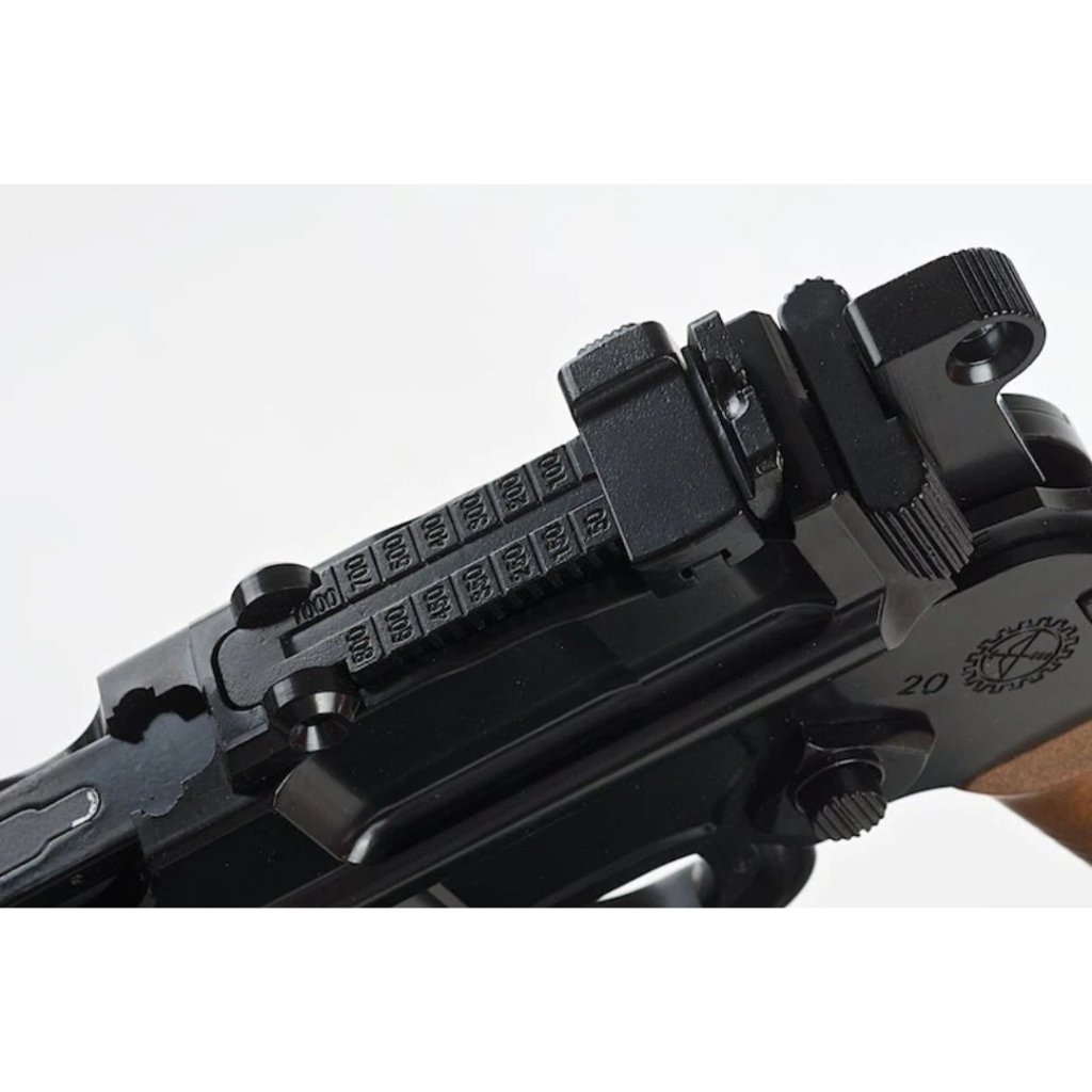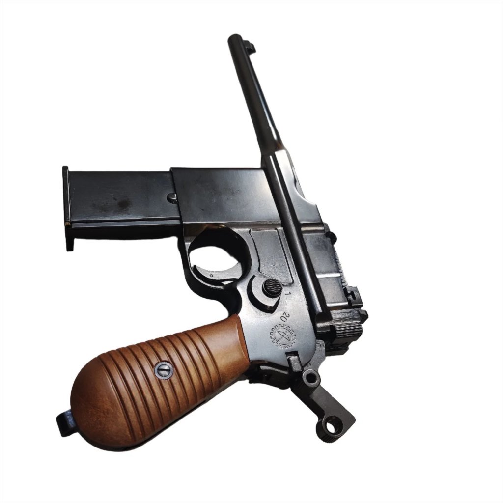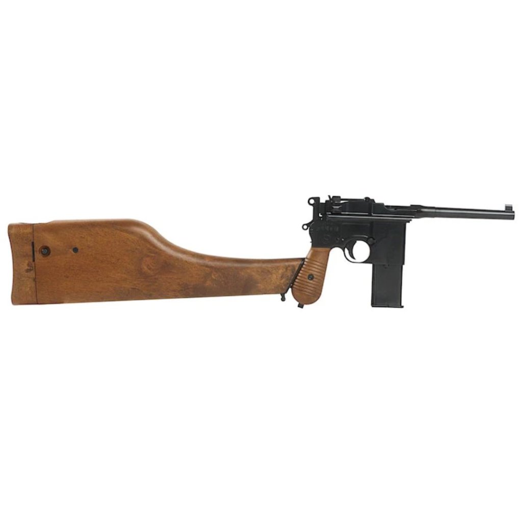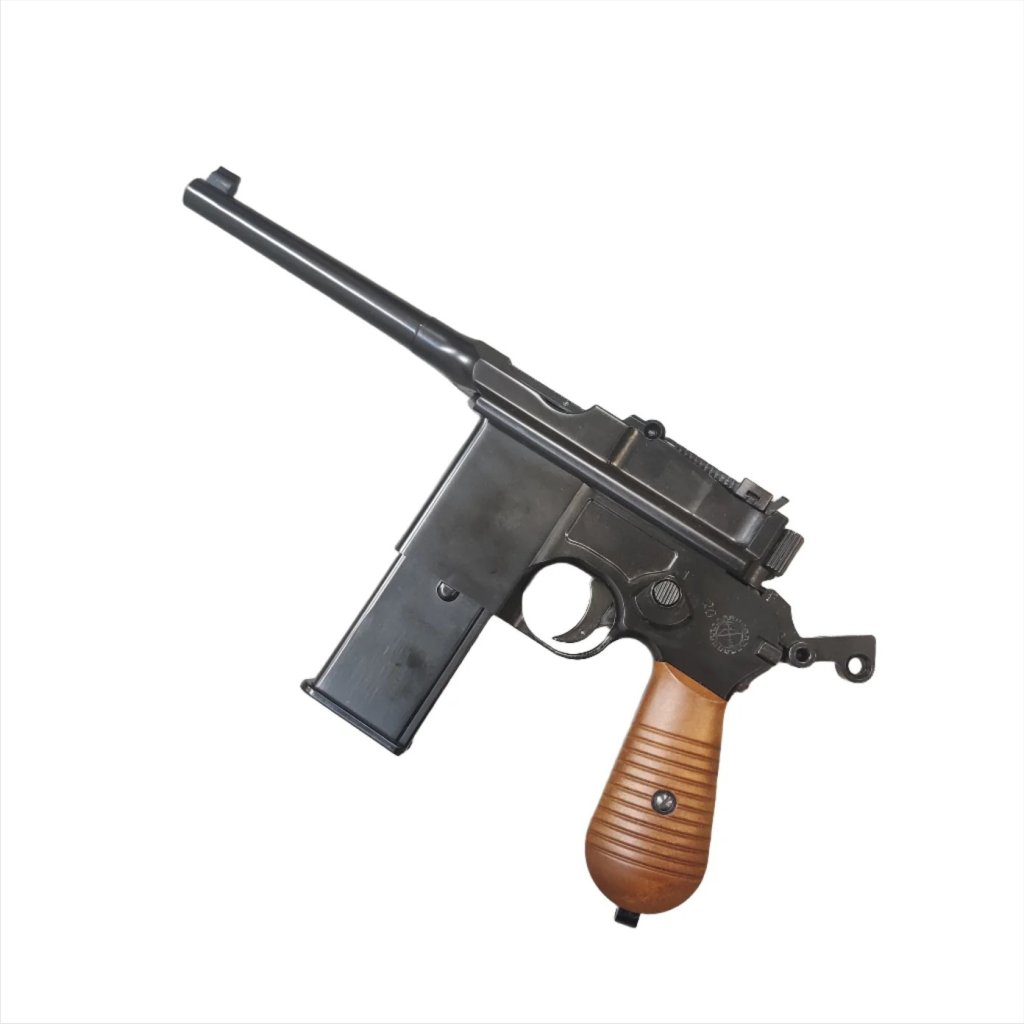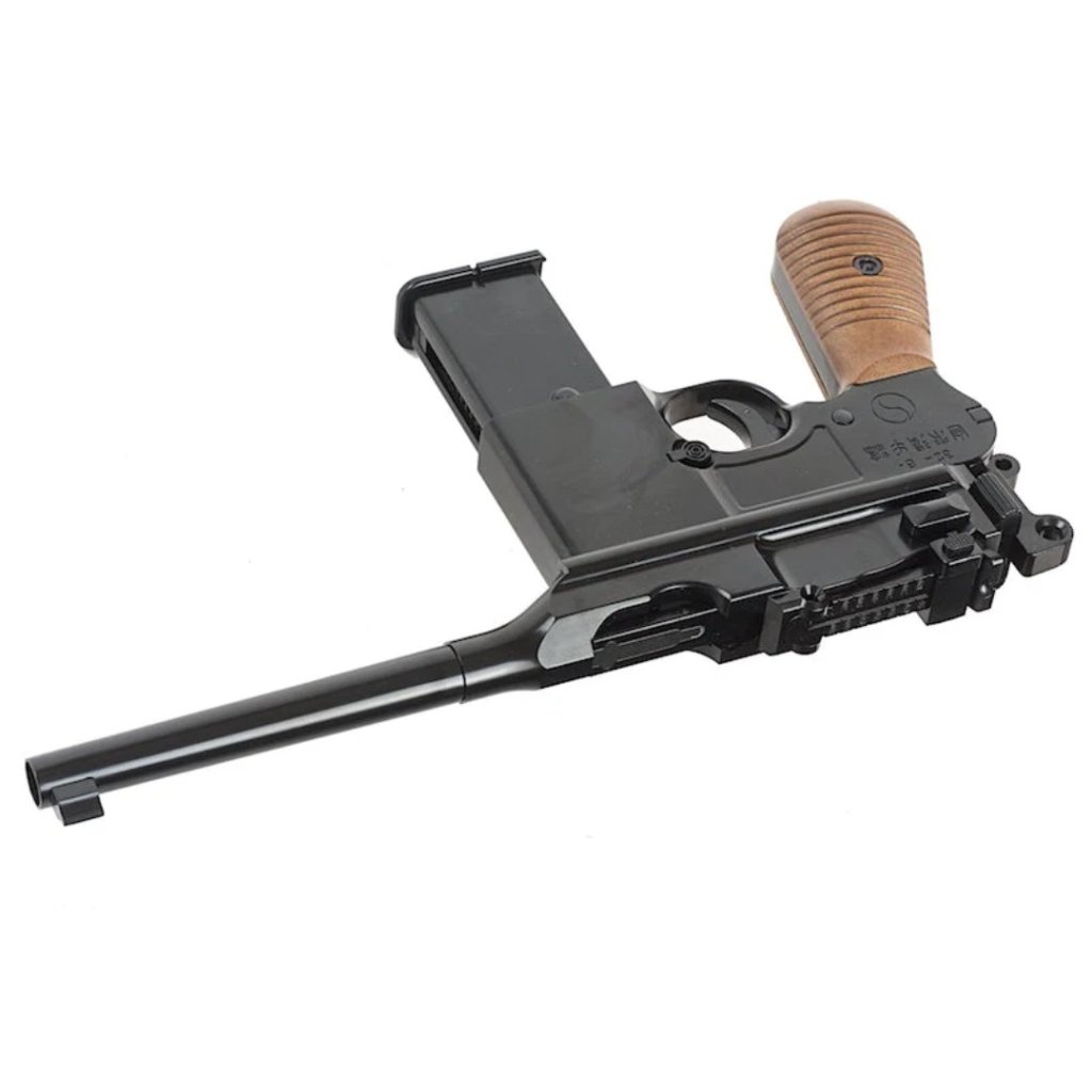 • The WE M712 'Broomhandle' is a select fire pistol in full metal with wood effect plastic handle grips and a detachable wood effect plastic stock that also works as a case.
