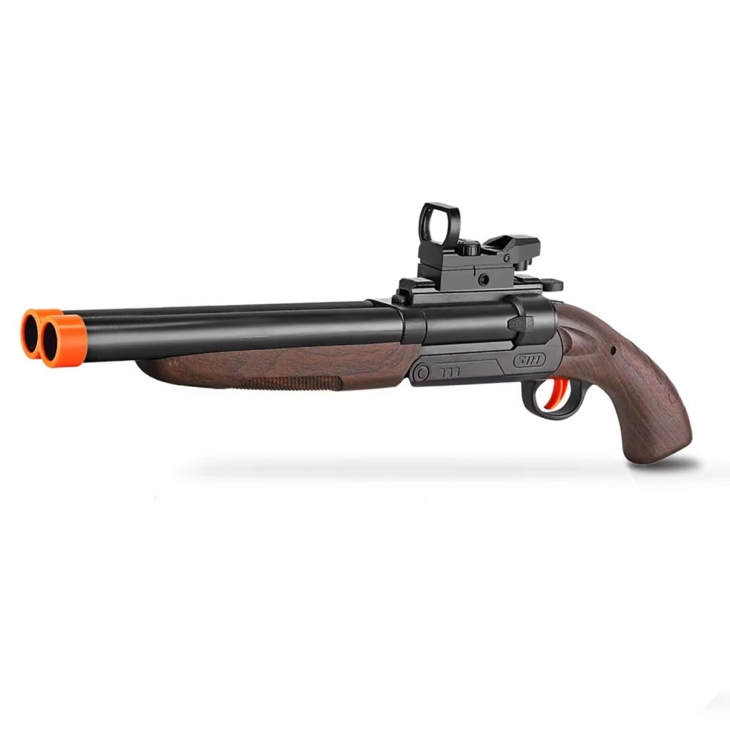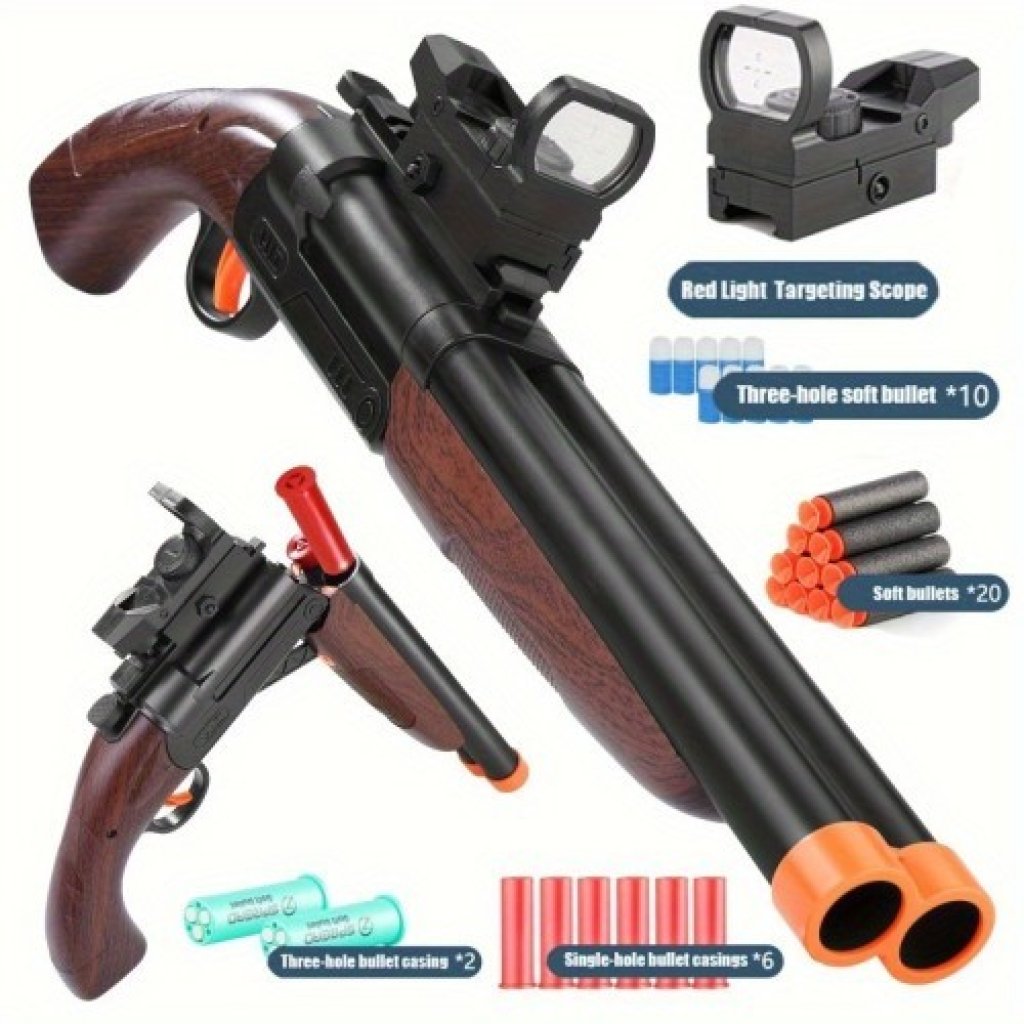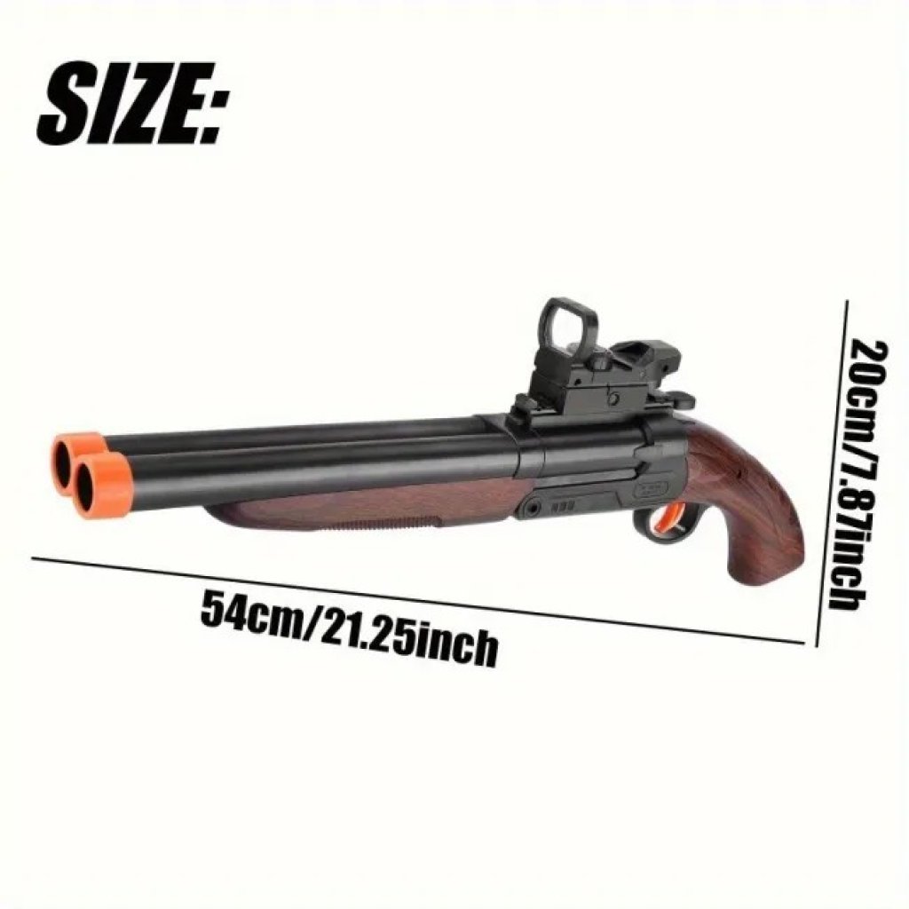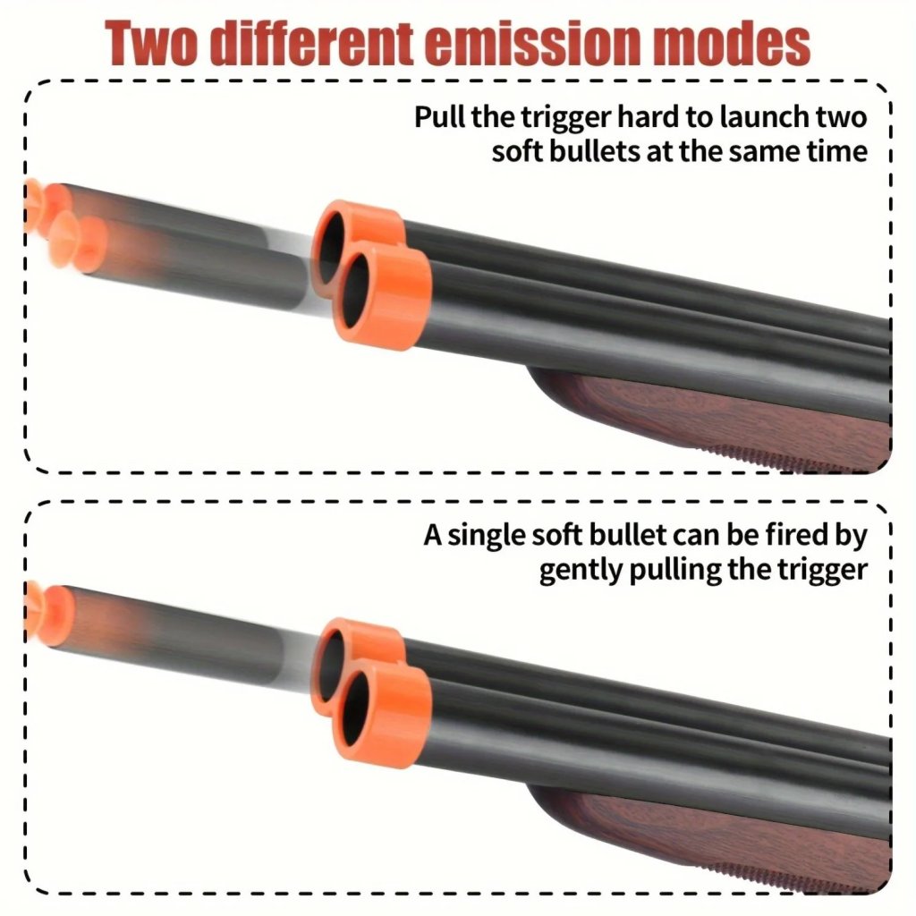 Load soft sponge ammo into the cartridge, move the top lever to fold the main body, load two cartridges into the horizontally positioned chambers, and pull the trigger to fire.