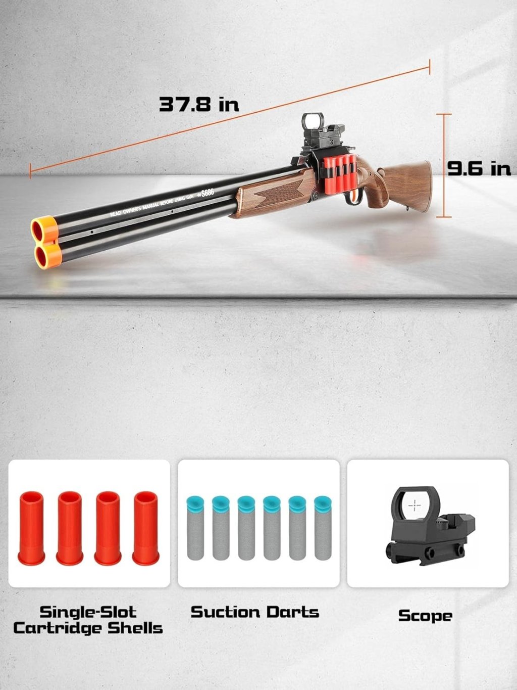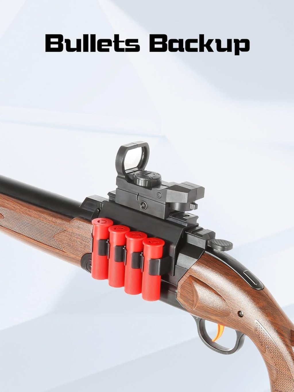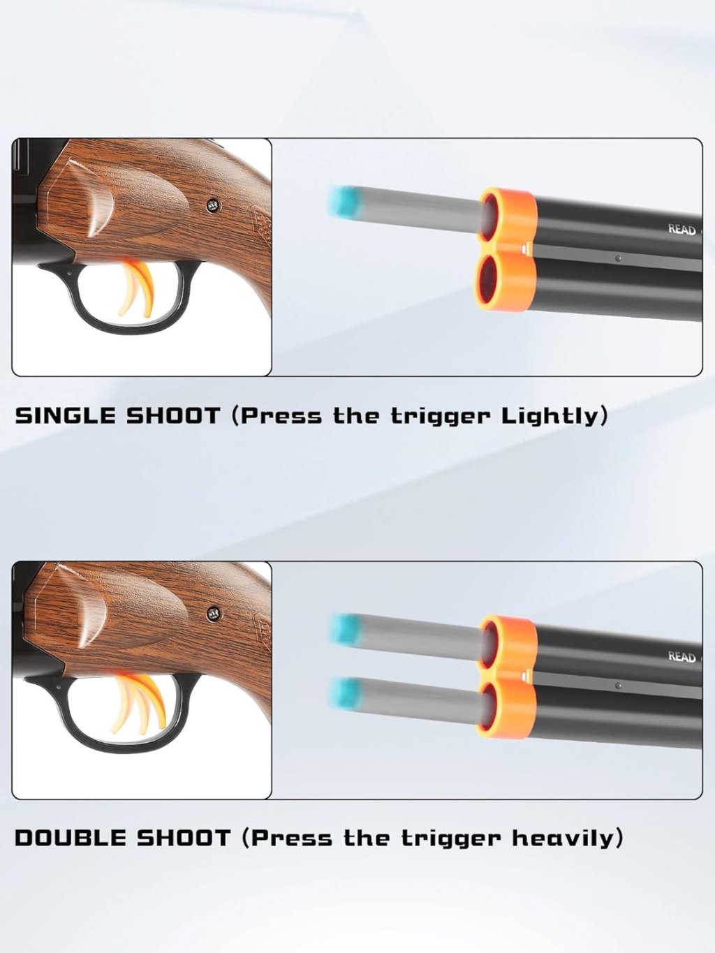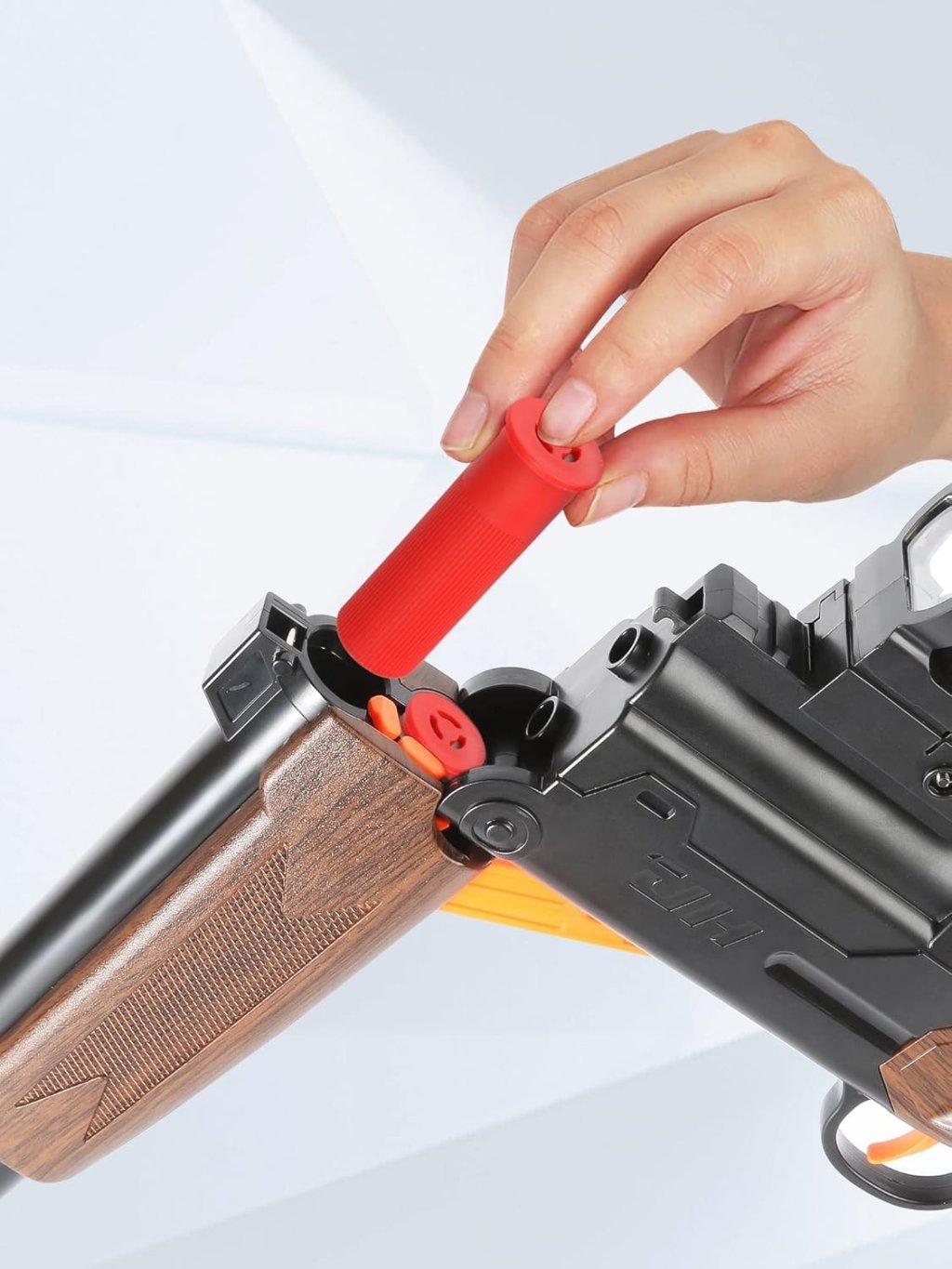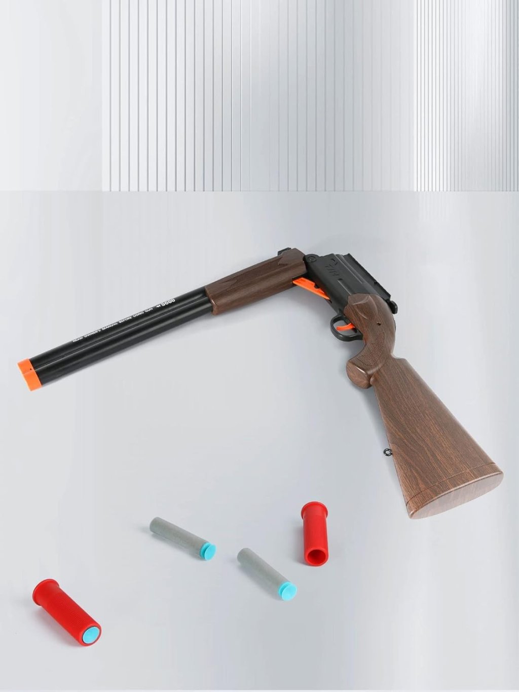 Load soft sponge ammo into the cartridge, press the top lever to fold the main body, and load two cartridges into the upper and lower chambers. Pull the trigger to fire.