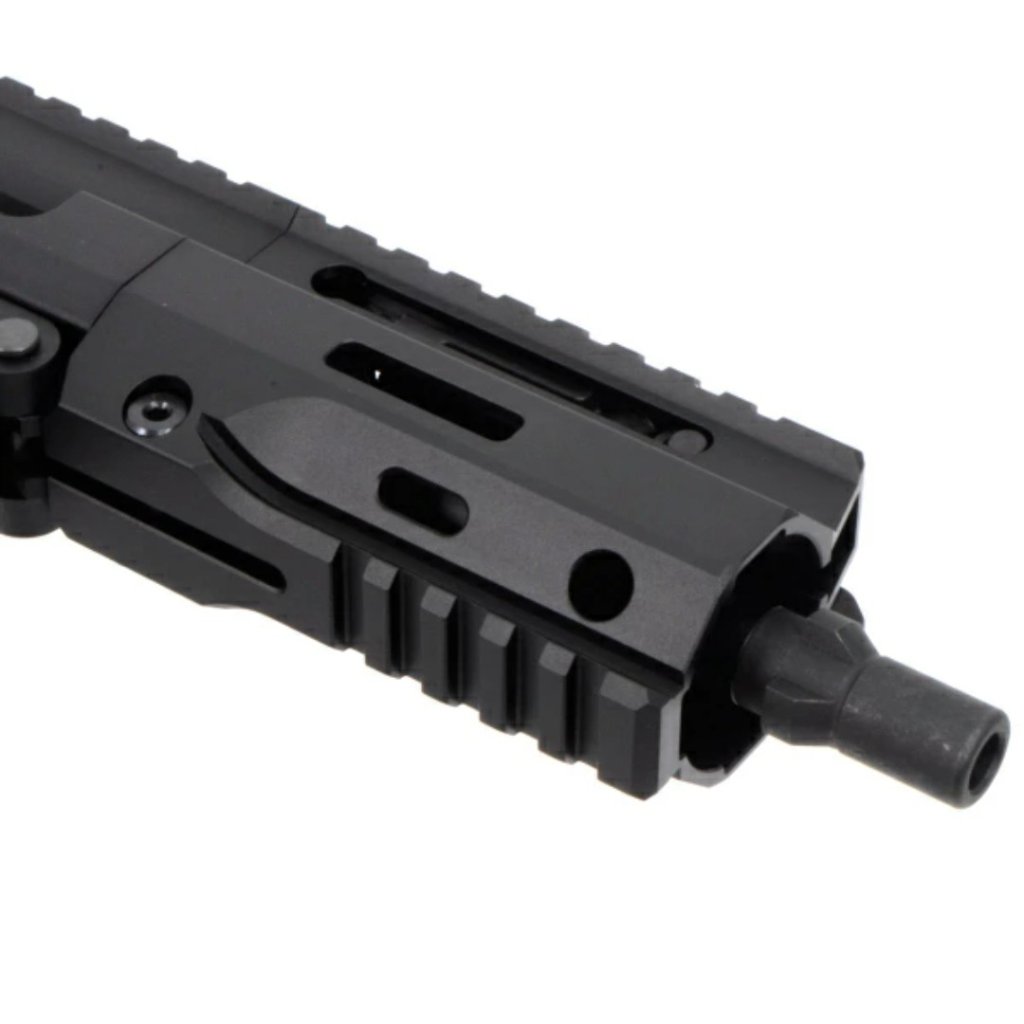 While B&T continues to supply the APC9, which is becoming a success, this rifle was developed and released in 2020 for a different market than the APC9. It is a rifle developed for organizations that have difficulty handling rifle-class bullets such as NATO 5.56mm bullets and 7.62mm bullets, and mainly use small-caliber bullets such as 9x19mm Parabellum bullets (H&K MP5, etc.), especially European police agencies. This product is a gas blowback made with the motif of the PDW model of the SPC-9, which has a 6.5-inch barrel and a lower receiver that uses a straight box magazine, among the B&T SPC-9 variants. As a bonus package, an engraved plate with the "B&T" logo engraved on it that can be attached to the lower receiver is included. The basic design follows the mechanism of Maruyama's SCW-9 gas blowback series,