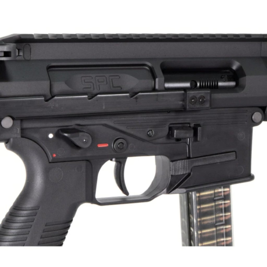 and the upper receiver reproduces the system that allows you to operate both the SPC-9's characteristic AR-style charging handle and the charging handle on the handguard,