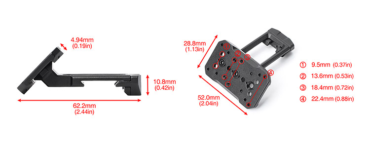 Provides a modular multi-hole mounting plate design, with multiple screw mounting positions to choose from during installation, covering almost all mainstream red dots on the market. When you want to install a red dot sight, this scope can be installed offset The base will be the best choice. It is thin, lightweight, high-strength, and can be adapted to most scopes on the market.