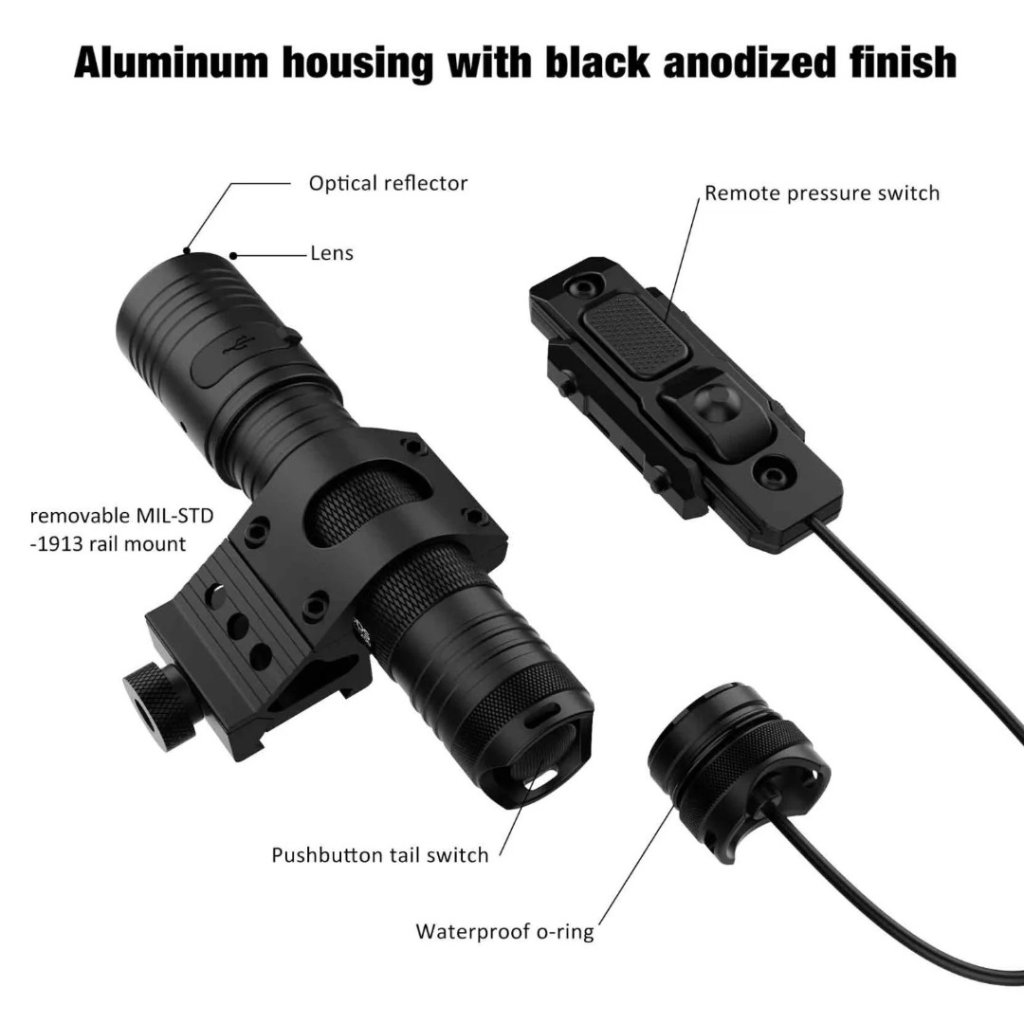 2) The entire housing of this tactical flashlight is made of Grade III anodized aircraft grade aluminum alloy, which is IP66 waterproof.