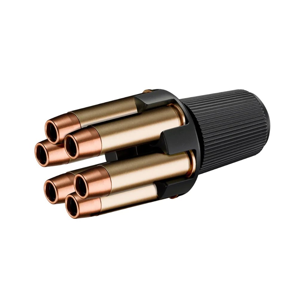 - To use, simply load six cartridges into the speed loader and twist the knob to secure the shells, then push into cylinder to release shells.