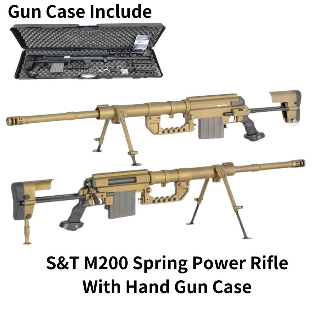The S&T replica is constructed almost entirely from CNC-machined aluminium with the trim parts being steel and the ergonomic "Target" grip made from high density polymer. Amongst the ST200's tricks are the ability to be quickly disassembled, compatibility with AEG standard upgrade springs, inner barrels and HOP-up buckings and rocking an integral Bipod and Monopod, allowing this hefty beast to be supported properly for improved accuracy and stability.