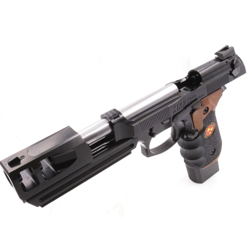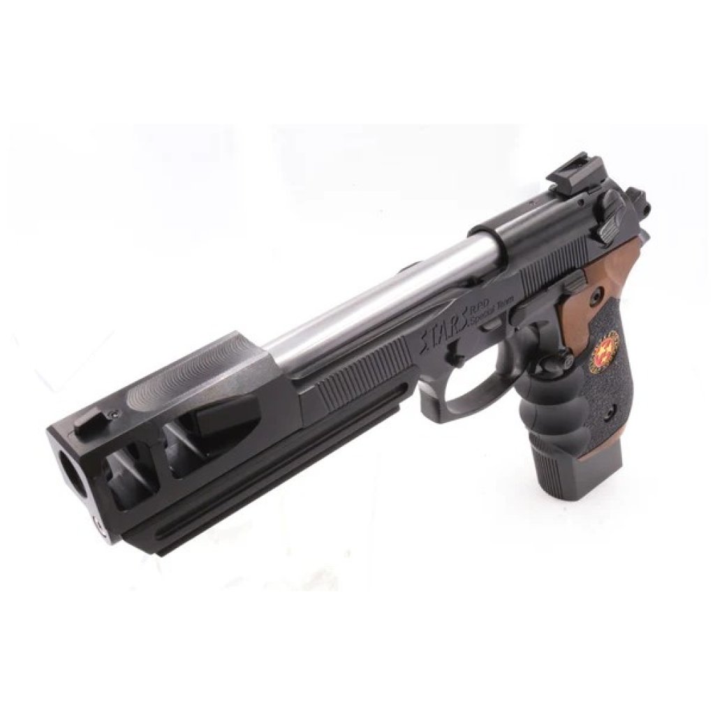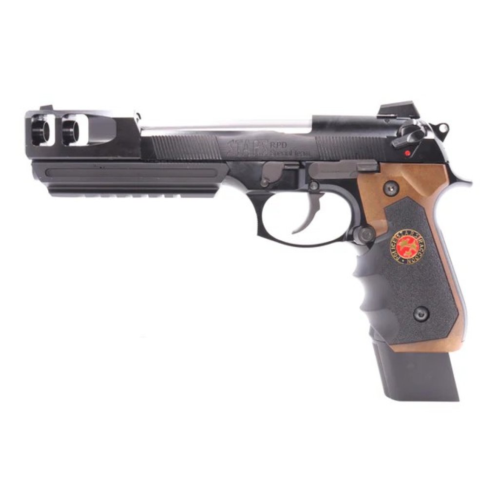 The weapon features a Silver Outer Barrel, Alloy Compensator, 20mm Rail and body with Polymer Hand Grips. The pistol is fully branded with 'S.T.A.R.S' badges and text, making the pistol true to the game. The weapon comes with a 20mm bottom rail allowing you to attach a multitude of lasers and torches to your pistol. Perfect for all Airsoft Skirmishers, or even those who want a piece of their favourite Game series to hang on the wall.