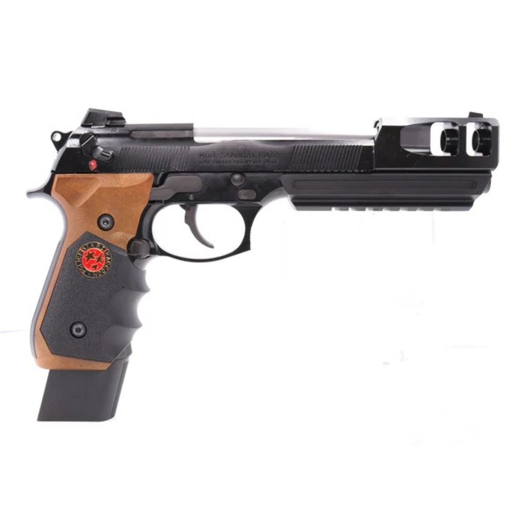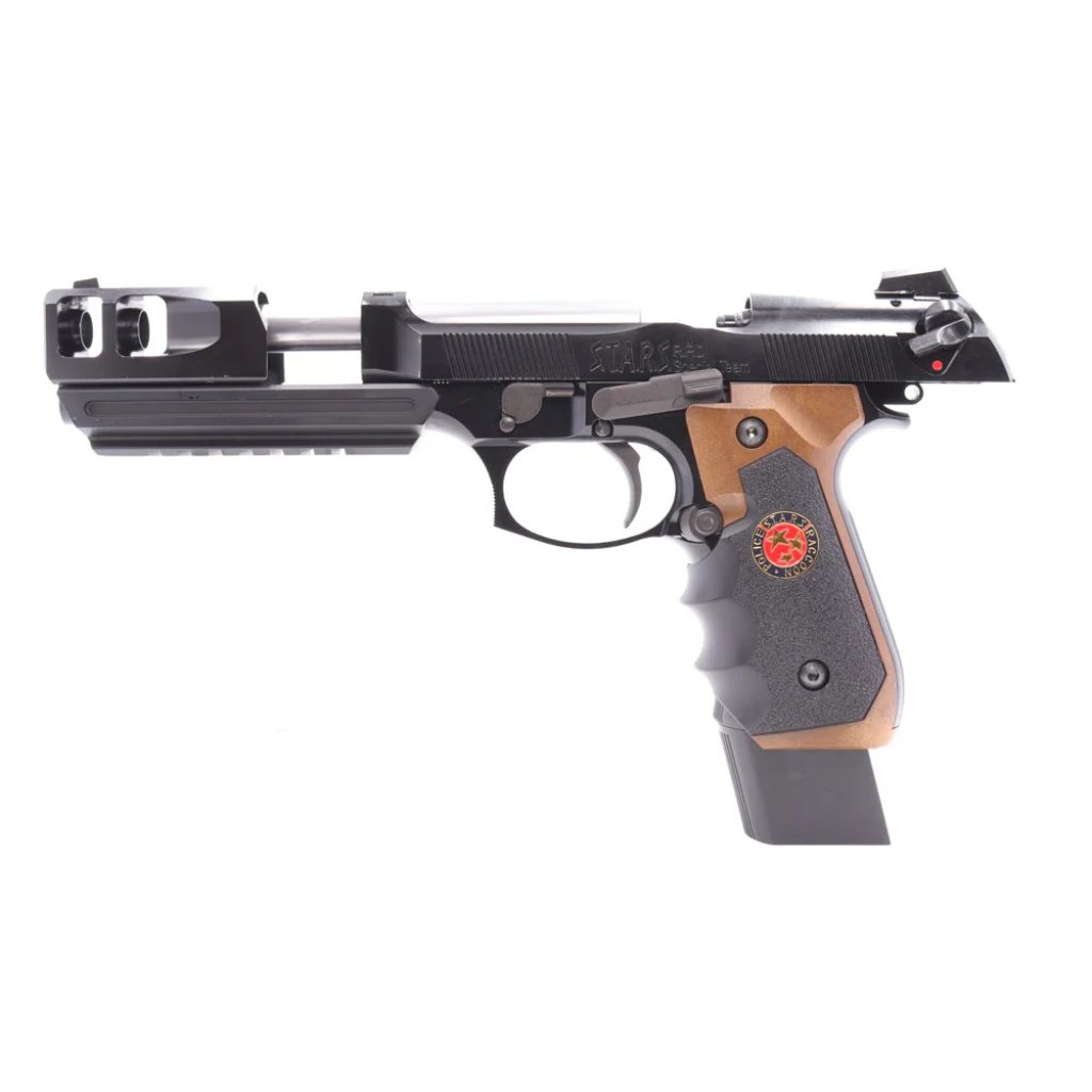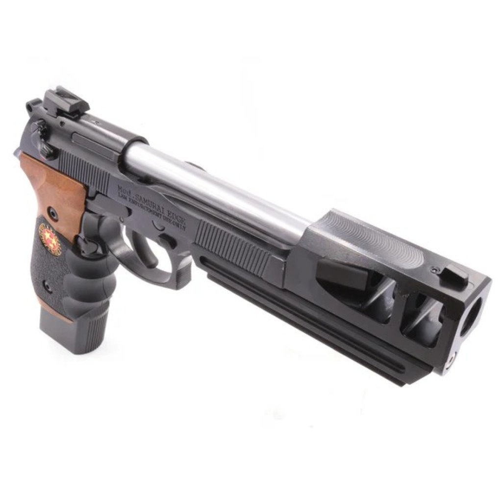 The weapon features a Silver Outer Barrel, Alloy Compensator, 20mm Rail and body with Polymer Hand Grips. The pistol is fully branded with 'S.T.A.R.S' badges and text, making the pistol true to the game. The weapon comes with a 20mm bottom rail allowing you to attach a multitude of lasers and torches to your pistol. Perfect for all Airsoft Skirmishers, or even those who want a piece of their favourite Game series to hang on the wall.