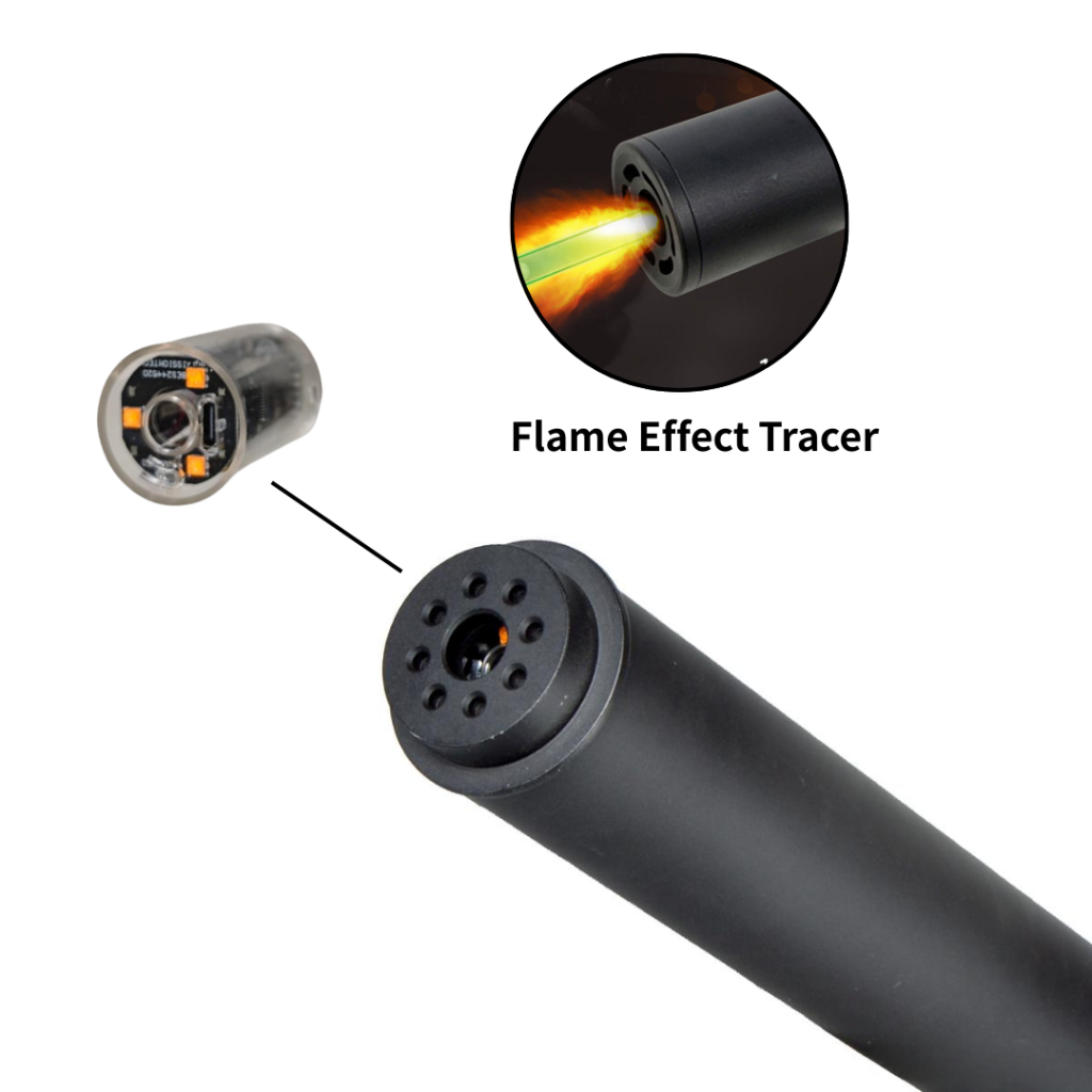 The silencer features a built-in fire tracer that can illuminate glow-in-the-dark BBs and simulate the appearance of a gunfire flame.