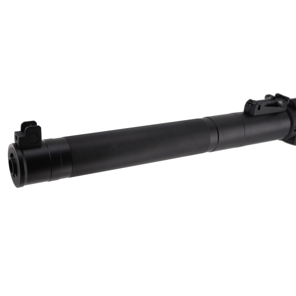 It is equipped with a metal front section with an internal silencer (and front and rear sights).
