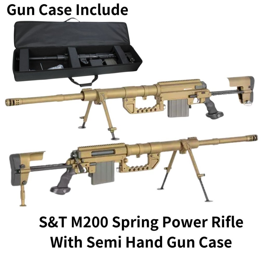 The S&T replica is constructed almost entirely from CNC-machined aluminium with the trim parts being steel and the ergonomic "Target" grip made from high density polymer. Amongst the ST200's tricks are the ability to be quickly disassembled, compatibility with AEG standard upgrade springs, inner barrels and HOP-up buckings and rocking an integral Bipod and Monopod, allowing this hefty beast to be supported properly for improved accuracy and stability.